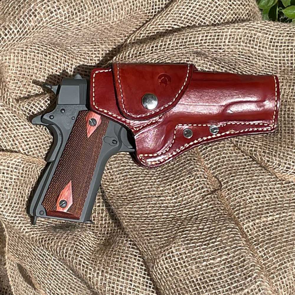 Fitting Note: This holster has been moulded to various models that feature different front sights, from night sights to the standard government issue "nub" sight. That being said, all 1911 A1 size pistols will fit in this holster. If you are carrying a model that features a larger front sight, it may be necessary to work the pistol into the holster several times to break up some of the leather fibers and get a proper fit. The leather will stretch out enough to accommodate your pistol.